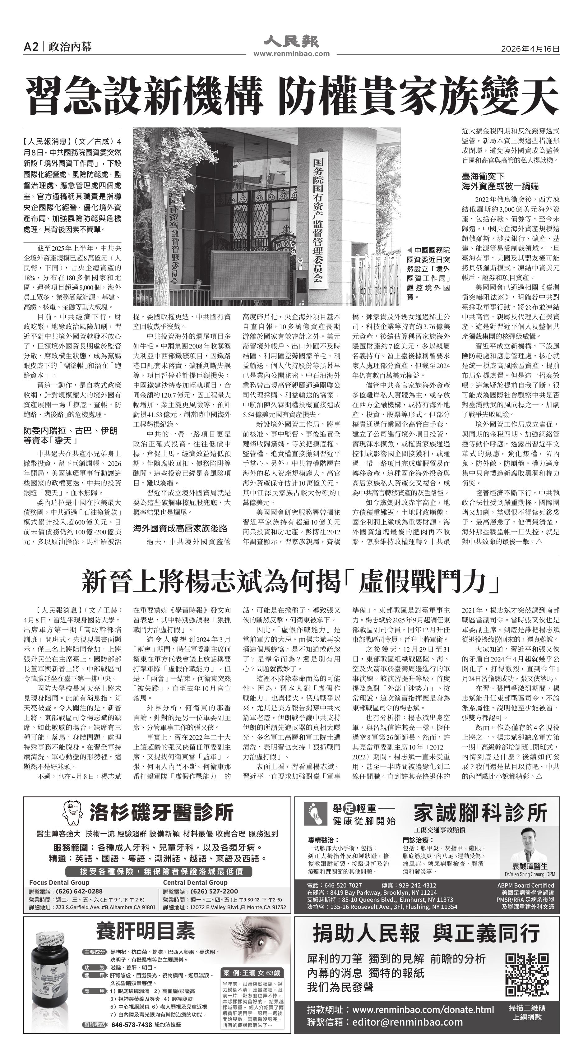 |<<  <<前一页 < 返回 第1060期  (2026年4月16日)A2版: 政治内幕 下一页>>  >>|