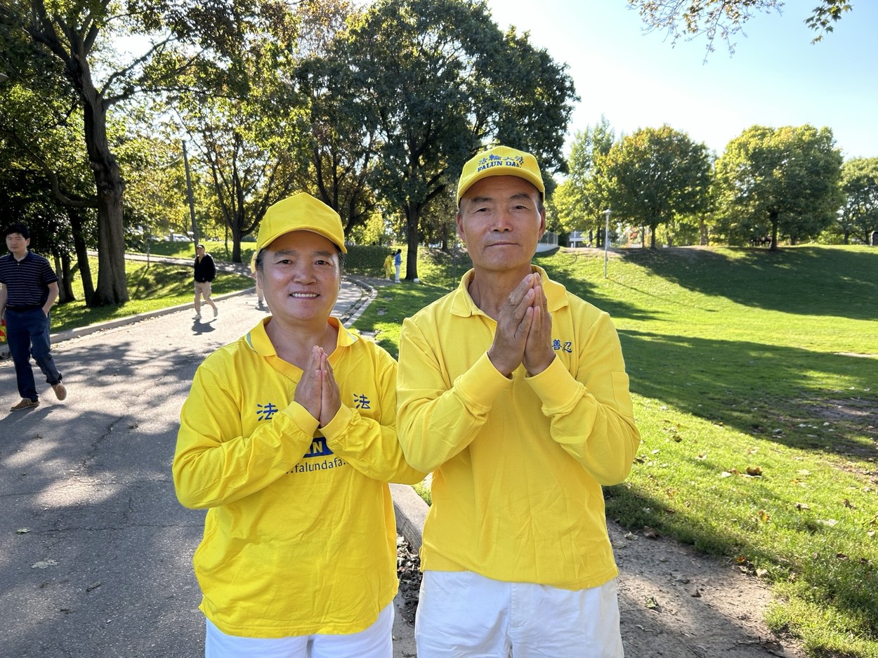 2025年9月28日,多倫多法輪功學員李國海和太太薛守麗恭祝李洪志師父中秋快樂。李國海說:「回想起我走過的路,遇到很多大關大難,都是慈悲偉大的師父看護、化解磨難,千言萬語也表達不了師父的救度之恩。」(伊鈴/大紀元)