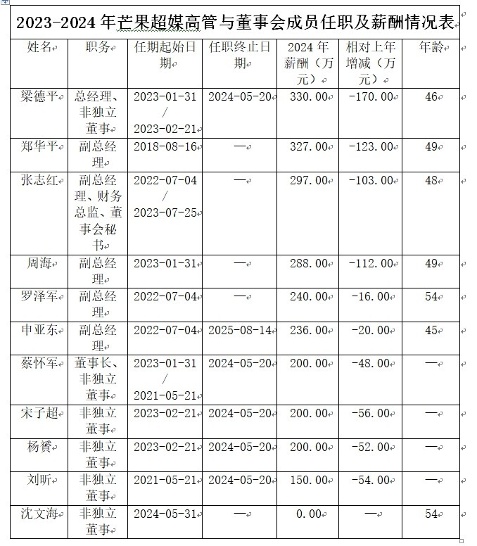 高管共 11 名,2023-2024年度总薪酬合计2468.00 万元,对比芒果超媒年报,高官人员工资占比偏高。