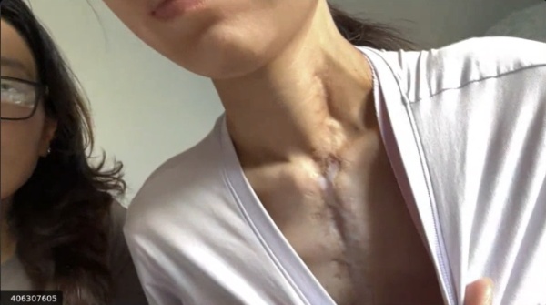 張琦胸部做過二十多次手術,來縫合氣管和整理胸腔。(視頻採訪截圖)