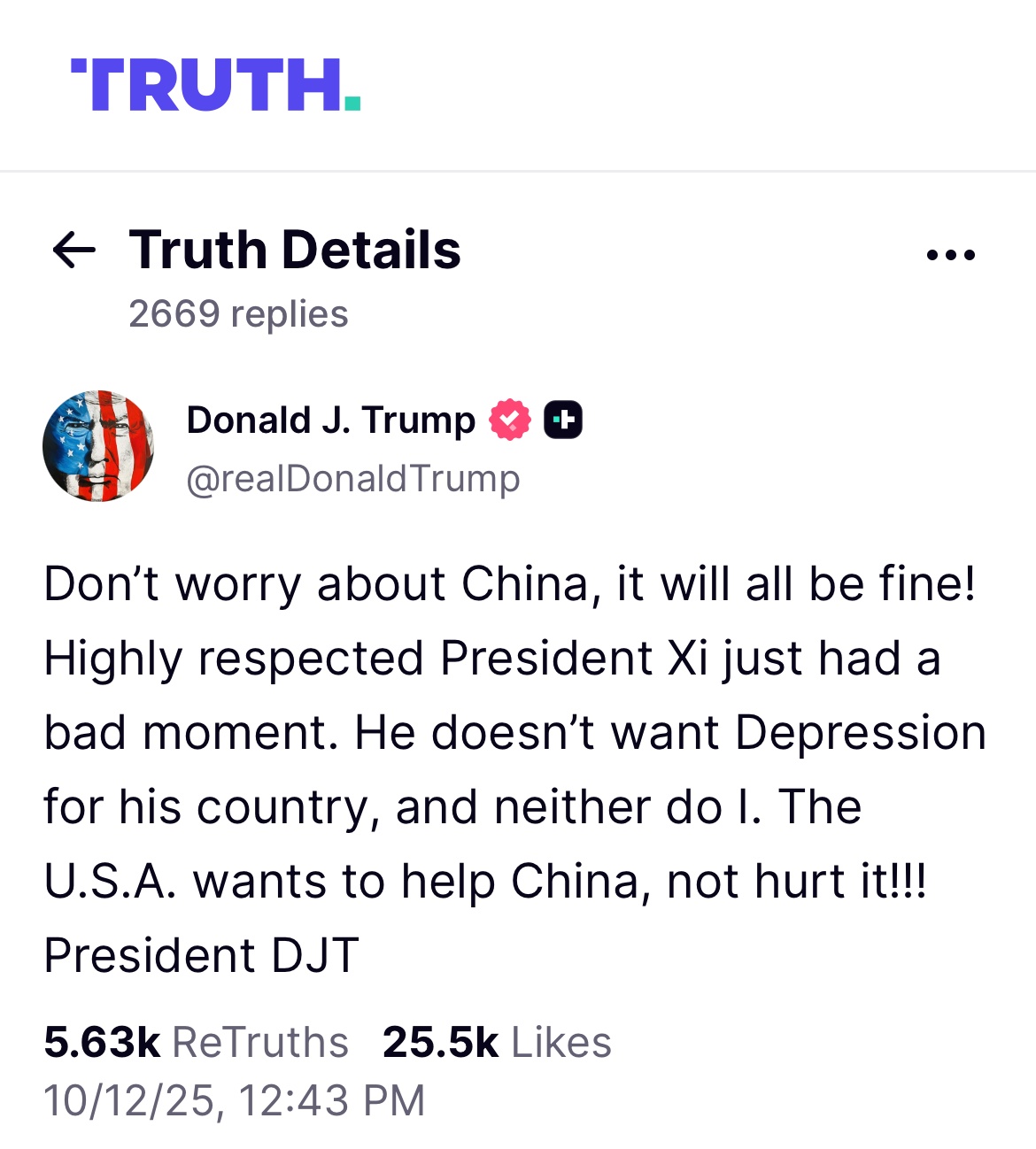 川普10月12日在Truth Social平台发文说:“不用担心中国,一切都会好起来的”。川普还说,习近平只是心情很糟糕(had a bad moment)。他认为,习近平并不想要中国陷入经济衰退,他也不想。“美国是想帮助中国,而不是伤害它。”