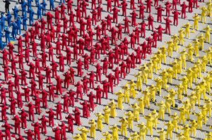 全世界最大「法輪圖形及『法輪常轉』」圖像 台灣法輪功排字至今已26年,學建築出身的吳清祥每年都擔任圖像設計。吳清祥表示,今年法輪功學員排出「法輪圖形及『法輪常轉』」圖像,因為這個圖像是早期台灣法輪功學員去中國跟大陸法輪功學員交流,第一次拿回台灣來的「法輪圖形掛圖」之一,所以排字的意涵,有「修煉不忘初心」的紀念性呈現。 吳清祥介紹,今天有逾五千位法輪功學員參加排字,今年排字圖像中,直徑超過66公尺的「法輪圖形」,是法輪大法的標誌,中間是一個大卍字符,四周四個小卍字符,以及兩個上紅下藍、兩個上紅下黑的太極。下方隸書體金色的「法輪常轉」,每個字寬21公尺、高17公尺。他說,每年排字都會上網,有中國民眾在網路留言說:「好壯觀、好殊勝!」 法輪功是一套以「真、善、忍」為核心理念的身心修煉功法。吳清祥說明,今年排出整體圖像的意義,是象徵法輪功從中國長春開傳後,迅速傳遍中國並洪傳全球,一直在世界上度化人,至今已洪傳世界逾110個國家及地區,並有越來越多的各族裔、不同膚色的人,相繼結緣喜得大法,身心受益。 吳清祥表示,排字難度逐年提升,需克服天氣、場地等不確定因素。他擔任排字協調人將場地分10個區,各區各有負責人,很重視與大家溝通與互相配合,確保活動順利完成。所有法輪功學員在排字過程中,遇到矛盾要按「真、善、忍」要求自己,能吃苦、有耐心、互相包容形成整體,並從中獲得身心靈的提升。