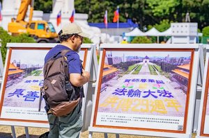 2025年10月18日,來自台灣、美加日韓、香港等地的部分法輪功學員逾五千人,在台北中正紀念堂自由廣場舉辦排字活動。圖為民眾觀看法輪功真相看板。(宋碧龍/大紀元)