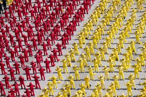 2025年10月18日,來自台灣、美加日韓、香港等地的部分法輪功學員逾五千人,在台北中正紀念堂自由廣場,排出巨型的「法輪圖形及『法輪常轉』」圖像。圖為法輪功學員大煉功活動。(宋碧龍/大紀元)