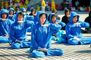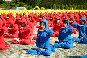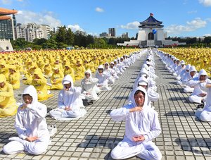2025年10月18日,來自台灣、美加日韓、香港等地的部分法輪功學員逾五千人,在台北中正紀念堂自由廣場,排出巨型的「法輪圖形及『法輪常轉』」圖像。圖為大煉功活動。(宋碧龍/大紀元)