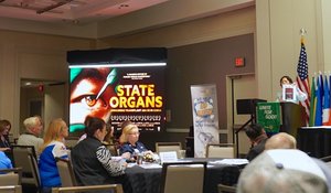 2025年10月3日,国际扶轮社在华盛顿DC的威斯汀酒店放映获奖纪录片《国有器官》。图为放映会后的专家与现场观众的互动环节。(张奕/大纪元)
