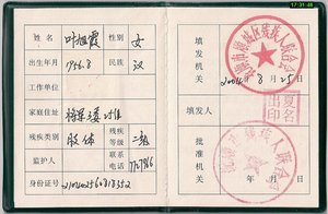 抚顺市残疾人联合会在2004年8月签发给叶旭霞的“肢体二级残疾”证书内页。(图片由叶旭霞女儿提供)