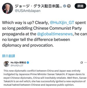 对此,美国驻日大使葛拉斯也“参战”,在X贴出了胡锡进文章截图,他并讽刺:“显然胡锡进在《环球时报》长时间帮中共宣传,以至于他已经分不清楚外交和挑衅的区别了。”