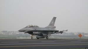 资料照片:2011年4月12日汉光27号演习,台湾空军401联队F-16B 6825战机演习高速路上起降。