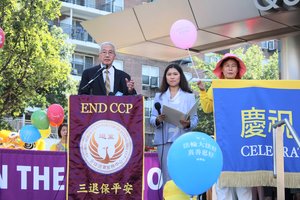 2025年8月10日上午,汪志遠在紐約法拉盛慶祝三退人數逾4.5億人的集會和活動現場講話。(黃小堂/大紀元)