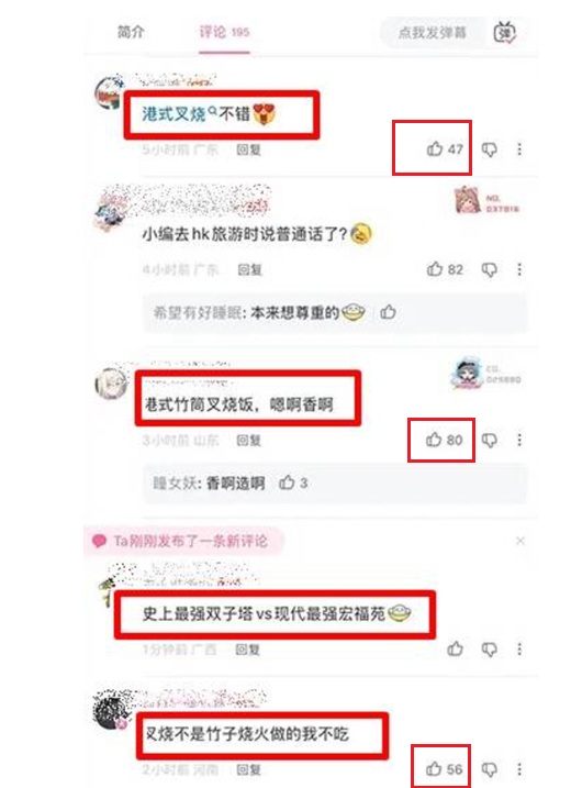 更令人不能接受的是,這部影片剛上網,一大群中共小粉紅魚貫而入,按部就班抵達戰場。他們似乎深怕有人看不明白《人民罔》令發布充滿了紅色色調的「今晚吃叉燒」,是與香港的大火有關,所以小粉紅們毫不顧忌的把此話題與香港宏福苑大火連接在一起,噴了一堆地獄哏,附和著叫囂「港式竹筒叉燒飯,嗯啊香啊」、「大埔不就有現成的嗎」、「懂你意思」、「史上最強雙子塔vs現代最強宏福苑」、「叉燒不是竹子燒火做的我不吃」、「這叉燒不用竹筒烤不正宗」,還有小粉紅挑釁的說道「可惜火太大,我的港式叉燒焦了」。