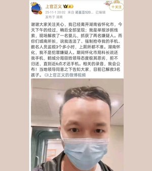 【人民报消息】(人民报记者金欣报导)“过去土匪在深山,如今土匪在公安”是中共执政的一大特色,意思就是指社会上很多的犯罪行为、犯罪集团背后的保护伞,就是当地的公安系统。中国的监控摄像头挂满了大街小巷,摄像头的密度是世界之首,但是如果有失踪大学生、或孩子被人贩子拐走,家属到派出所报警,十有八九都会被拒绝。甚至那些见义勇为出手抓住人贩子的侠义之士,还会被派出所当作嫌疑人囚禁。 四川公民上官正义,经常以一己之力追查代孕、拐卖人口,11月1日他在湖南省怀化市举报有人买卖婴儿后,竟被警方倒扣了一个“违法”的罪名,被禁锢在派出所,差一点就人间消失。消息令中国网友炸锅,呼吁追查当地公安是否与拐卖犯罪组织互相勾结。 11月1日中午,上官正义在个人微博帐号发文指出,怀化当地的袁姓女子,透过小红书从生母手上低价买入婴儿,再寻找买家以高价卖出,他在怀化报案后顺利救出1名婴儿,并且抓住了2名准备交易的仲介。 不过,当天下午,上官正义在微博发文求救,指称“我中午替他们解救了婴儿,抓了2名嫌疑犯。怀化市城南派出所所长说我违法了,强制收了我两部手机,专人看管我”,请求外界帮帮忙。 到了当天晚间8时许,上官正义终于出面报平安,他透露自己下午被怀化城南派出所所长抢夺手机,并由数名包夹人员监视3个多小时,连上厕所都不准。期间怀化市公安局某科长打算归还他的手机,但怀化公安鹤城分局一名田姓领导态度恶劣拒不归还,直到将近晚上6时才将手机交给他。 由于此事引起众多网友关注,鹤城分局不得不在第二天(2日)发布通告,证实存在贩婴行为,截至目前为止已逮捕4名嫌犯、救出3名婴儿,但通告中并未提及一度扣留上官正义的行为,仅表示“对举报人(亦即上官正义)协助公安机关调查取证等情况,将全面调查核实”。 对此,上官正义在2日下午在微博发文表示,他在1日晚间离开当地后,怀化市完全没有任何单位向他联系,痛斥根本不存在“全面调查”。 有网友表示,上官正义在“打拐”方面知名度很高,许多人都认识他。他做的事,替不少警察解决的许多问题。但这一次,他踢到钢板上了。解救了一个孩子,抓住两个人贩子,结果他“违法”了,被怀化城南派出所所长提溜进了局子,没收了手机,差一点就人间消失。 网友说:“上官正义是英雄,但是在某些警察眼里,他真是一个棘手的家伙。难道怀化城南派出所是人贩子的保护伞?”
