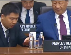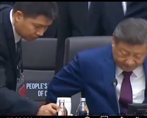 【人民报消息】(人民报记者文谨报导)中共党魁习近平和一众高官出席韩国APEC会议期间,发生许多让民主国家领导人感到不可思议的笑料,成为茶余饭后的谈资。此外,韩国媒体还拍下诡异一幕,在习近平刚刚落座时,一名随身侍卫随即上前,悄悄递给他三样东西。网民猜测,习近平疾病缠身,特工给他送的东西,其中有药。 前媒体人“@Fangliusy”在海外X平台贴文说:“习近平这罕见一幕被韩国记者拍下来了”。视频显示,在韩国庆州举行的APEC会议上,习近平刚一落座,一名中国男子随即上前,先把一个白色的保温杯放在桌上,然后蹲下,从衣服下方的口袋掏出一叠疑似面巾纸,再从胸前口袋拿出一个类似眼镜盒的东西。这名男子把这些物品摆在习近平的桌上时,表情紧张,眼睛还不时警觉地斜视四周,让人感觉鬼鬼祟祟,似乎担心被人发现。 贴文还说:这些物品“竟然不是装在正规收纳包内!第一样是杯子,是药还是茶?不知道,估计是药;第二样是发言用的资料小卡片吗?第三样应该是眼镜”。