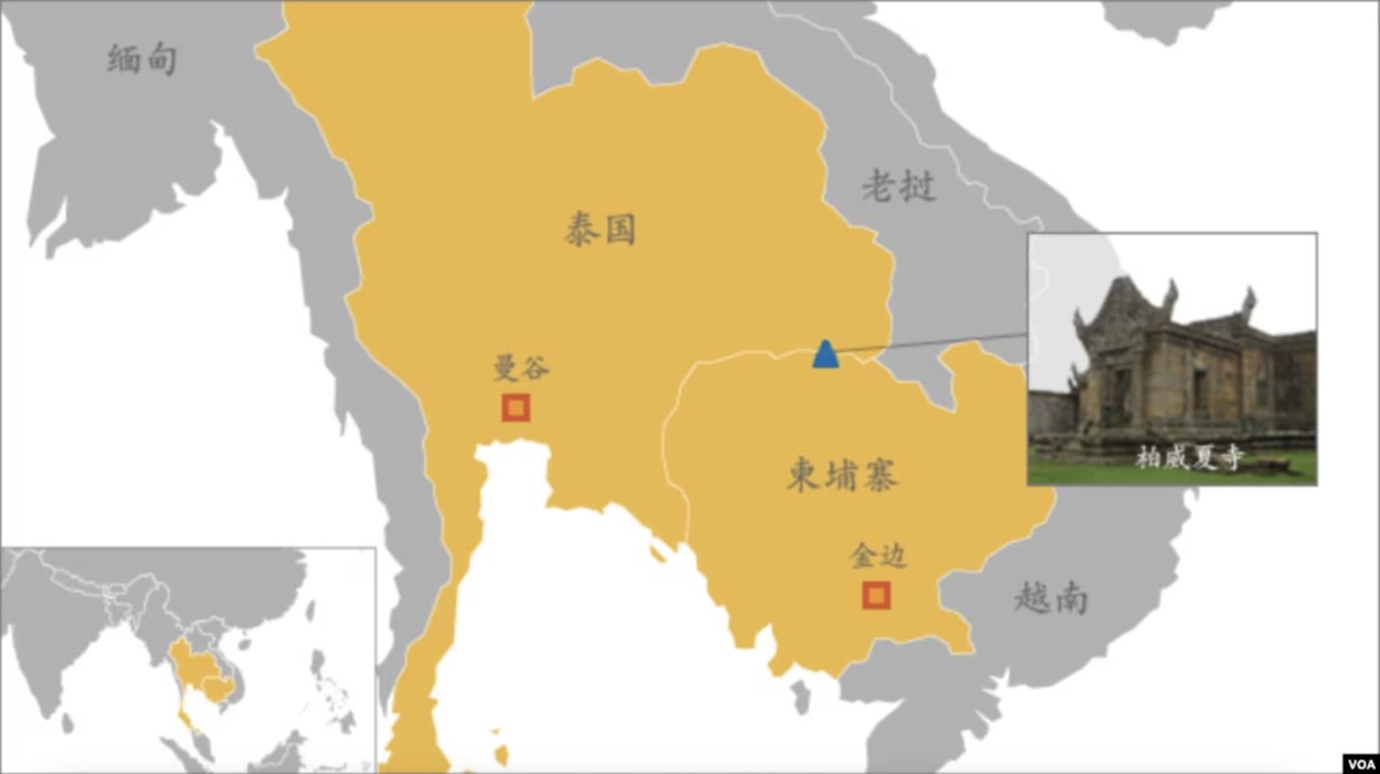 泰國和柬埔寨地圖,以及引發衝突的柏威夏寺