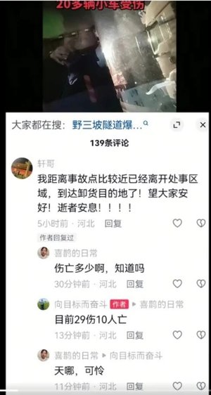 【人民報消息】(人民報記者程曦報導)近日,大陸社交媒體盛傳,12月17日,北京七環高速G95河北路段都衙隧道內一輛天然氣罐車發生碰撞後起火爆炸。網友發布消息說,有20多輛車嚴重毀損,死亡10人傷29人,屬於重大事故。目前,未見大陸官方通報該起事件。 從網友發布的視頻顯示,爆炸發生時,隧道內火光沖天,濃煙滾滾。爆炸後,隧道內一片狼藉,滿地車輛殘骸,多達20多輛車嚴重毀損,慘不忍睹。有些車輛已經被炸得支離破碎,車輛裡面的人員狀況讓人堪憂。 北京七環高速G95河北路段都衙隧道爆炸視頻 很多大陸網友發帖透露這起爆炸事故的消息。 「事發時隧道裡面有幾十輛車,人基本上都沒有跑出來。」 「我的好兄弟在那個隧道裡失去了年輕的生命,才37歲,連人都找不到,只撿到2塊骨頭。」 「我距離事故點比較近,已經離開處(出)事區域。」 「目前29傷10人亡」。 還有網友表示:「剛村裡的打電話,我的朋友沒了。」 「好多車都炸了,隧道都塌了,火著了兩天。」 「隧道裡油罐車爆炸涉及幾十輛車,死傷很嚴重,逆向隧道也都是煙」。