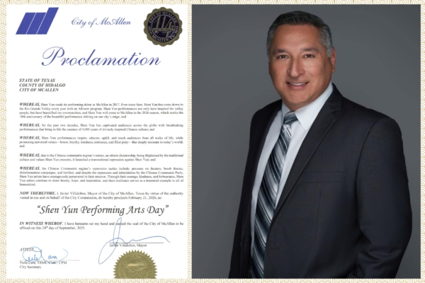 麦卡伦市市长哈维尔‧维拉洛博斯(Javier Villalobos)回顾道,神韵于2017年首度在该市登台,此后每年皆携全新节目莅临里奥格兰德河谷(Rio Grande Valley)。他强调:“神韵演出不仅激励河谷居民,更为社区增添光彩;神韵将于2026年演出季重返麦卡伦,届时将是这台精彩演出在本市舞台绽放10周年。” 他谴责中共跨国镇压:“中国共产党政权本质为无神论独裁政权,因恐惧神韵所展现的传统文化与价值观,遂发动跨国打压神韵。”