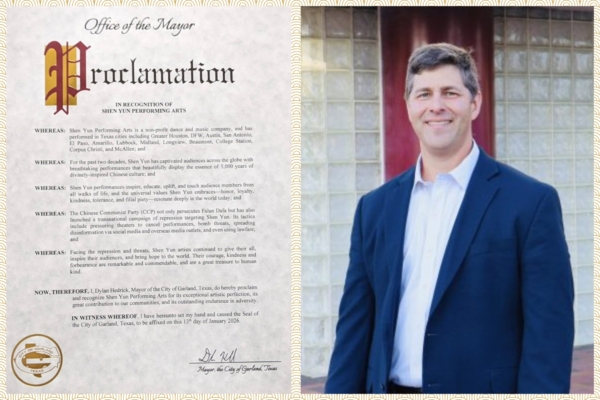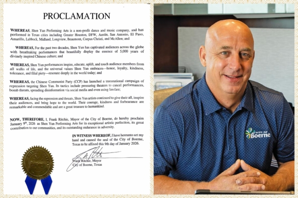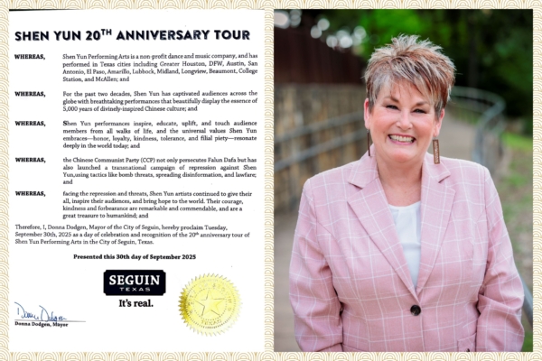 【人民报消息】神韵艺术团即将在2026演出季中,迎来巡回演出20周年。美国德克萨斯州继六城市嘉奖神韵(请看这里)后,又有埃尔帕索市(El Paso)、加兰市(Garland)、麦卡伦市(McAllen)、朗维尤市(Longview)、塞金市(Seguin)和伯尼市(Boerne)六座城市的市长,代表市议会向神韵致赠褒奖。 神韵是“人类珍贵典范” 他们在褒奖公告中写道,神韵艺术团为非营利性乐舞团体,二十年来巡回演出足迹遍及德州各大城市(包括大休士顿地区、达拉斯-沃斯堡、奥斯汀、圣安东尼奥、埃尔帕索、阿马里洛、拉伯克、米德兰、朗维尤、博蒙特、大学城、科珀斯克里斯蒂及麦卡伦等)。 市长们一致称赞,神韵以震撼人心的演出,生动展现五千年神传中华文化的精髓,令全球观众为之倾倒;演出激励、教化、鼓舞并触动各阶层观众,弘扬“忠、义、仁、恕、孝”等普世价值,在当今世界引起深刻共鸣。 公告指出,中共不仅迫害法轮功,更发动跨国打压神韵的行动,手段包括施压剧院取消演出、散布炸弹威胁、通过社群平台及海外媒体散播虚假信息,甚至动用法律战。然而,面对打压与威胁,神韵艺术家们凭借勇气、慈悲与宽容,持续传递美、希望与启迪;坚韧精神堪为全人类珍贵典范。 四座城市宣布“神韵日”