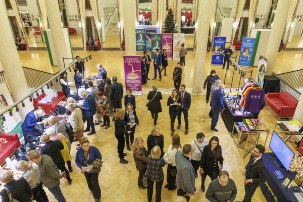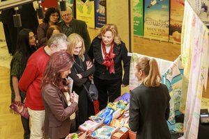 2026年1月12日晚,神韻巡迴藝術團在波蘭羅茲的羅茲大劇院演出。觀眾被精美的神韻商品所吸引。(張清颻/大紀元)