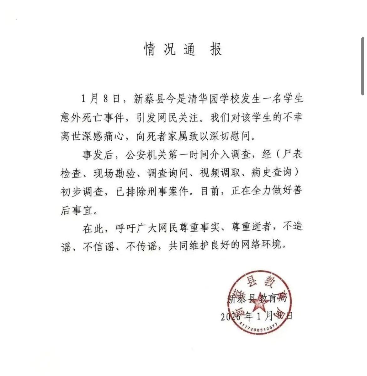 河南新蔡縣教育局通報。(網絡截圖)