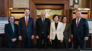 照片說明:美國商務部長盧特尼克(左三)、美國貿易代表格裡爾(左二)和美國在臺協會華盛頓總部執行理事藍鶯(左一)與臺灣行政院副院長鄭麗君(右三)、臺灣行政院政務委員楊珍妮(右二)和臺灣駐美代表處代表俞大㵢(右一)。