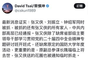 蔡慎坤分析,很长一段时间,反习派对张又侠寄予厚望,而且他在元老中也有很大影响力,但张又侠一直迟迟按兵不动。他在X上发帖说,去年底网上出现了一封致张又侠将军的信,呼吁张又侠顺应民心党心,发动一场针对习近平的军事政变。