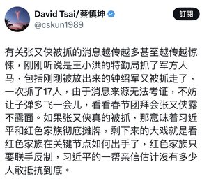此后,蔡慎坤再度发帖表示,他得到了有关张又侠被抓的消息,而且越传越惊悚。
