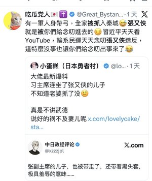 没过多久,他又再度发帖说:“张副主席的儿子,也被带走了,还戴著黑头套,极具羞辱的意味......”