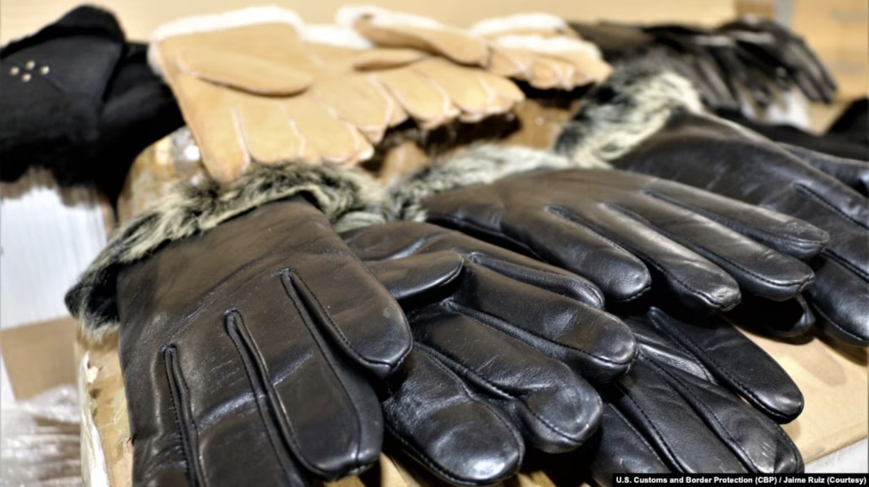 資料照片:美國海關和邊境保護局宣布在洛杉磯/長灘海港扣押源自新疆涉嫌為強迫勞動產品的一批女式皮手套。(2020年9月15日)