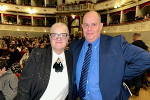 2026年1月27日晚,一家復古服裝公司老闆Simone Martini和太太Paola Bonacchi觀賞了神韻紐約藝術團在利弗諾的戈爾多尼劇院(Teatro Goldoni)的首場演出(Leo Botnarenko/大紀元)。
