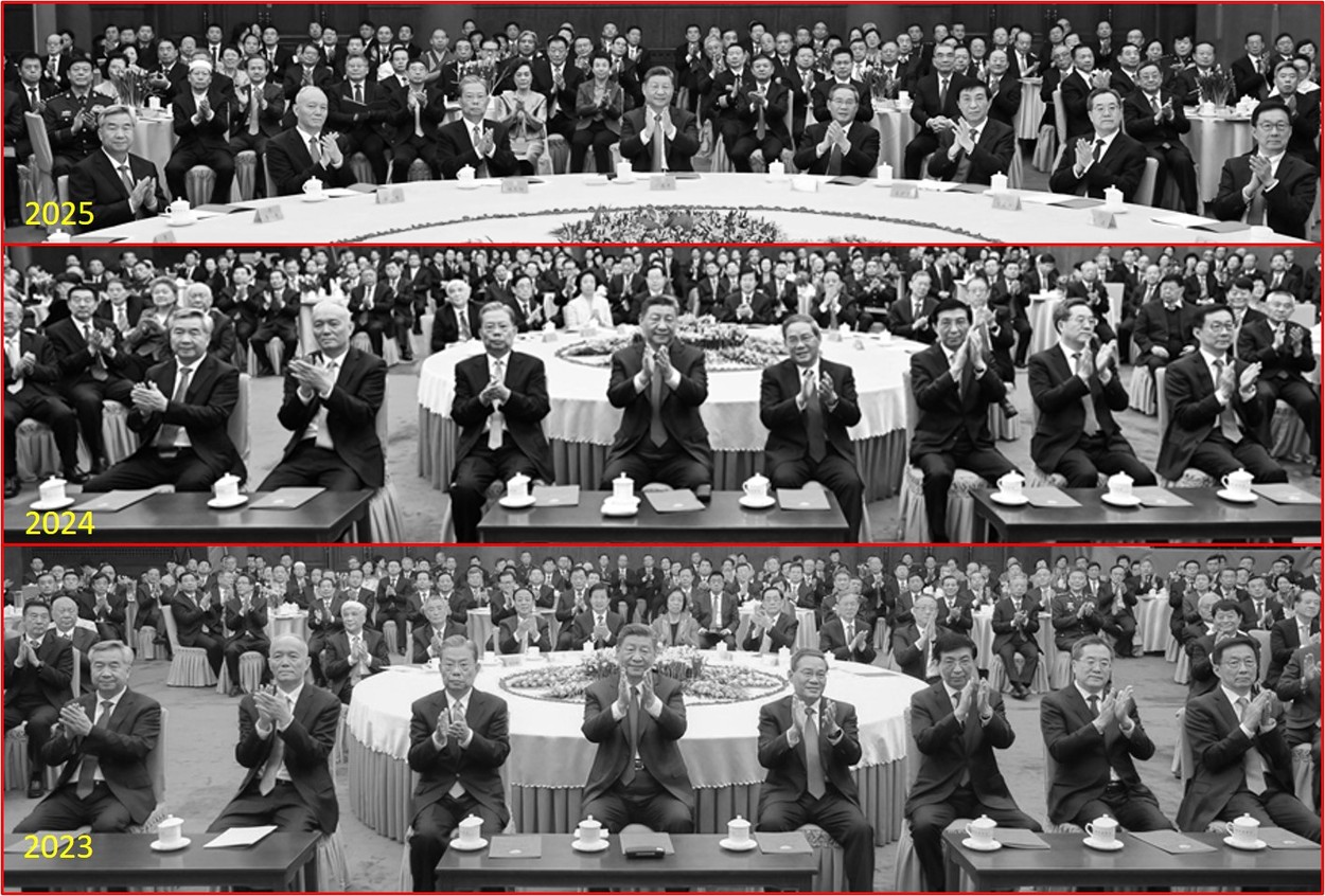 但2025年茶话会,未再按惯例添加三张条形桌;习近平与其他人一样坐在大圆桌上观看演出。新华社报导中配图也改为大圆桌合照。