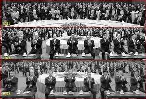 另据中共央视画面显示,2023年至2025年三年的政协新年茶话会,一开始听取发言时,习近平等七名政治局常委、国家副主席韩正以及各民主党派的中央主席一同在大圆桌上落座。2023年、2024年茶话会发言后观看文艺演出时,在大圆桌前特别添加三张条形桌,供习等七名政治局常委与韩正落座、观看演出。新华社报导中合照呈现的就是这一画面。