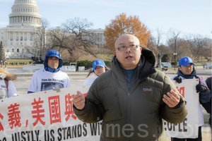 圖為2019年12月3日,中國民主黨美東黨部副主席石宇歌參加集會發言。(林樂予/大紀元)