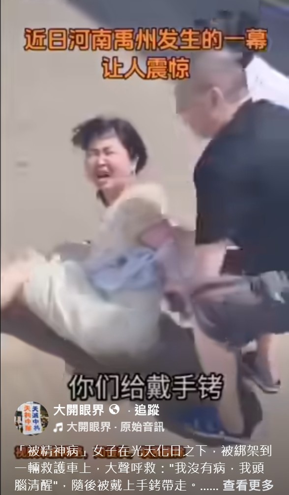 去年夏天,一名女子被医护人员当街考上手铐,摁在担架上塞入一辆来历不明的救护车带走。过程中该名女一直挣扎,并大声呼救,但无人出手相助。(视频截图)