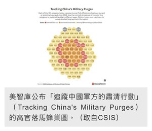【人民报消息】(人民报记者程曦报导)大家最近有没有听说一张“蜂巢图”?这张图不是什么高科技产品,而是美国智库 CSIS 最新发布的共军“高官落马图”。根据这份报告,共军内部正在经历一场比外界想像中还要严重、规模甚至可以说是“史无前例”的大清洗。习近平自毁长城,但同时也表现出他的破坏力惊人,没有辜负“加速师”的称号。 “蜂巢图”——习近平自毁长城 据《自由时报》报道,这张图表中,密密麻麻地布满了 101 个多边形,每一个蜂巢单元就代表一名落马或疑似落马的高级军官。图表用颜色区分了这些官员的命运:红色代表被开除党籍,橘色是被撤职,灰色代表已被肃清或S亡。但最引人注目的是那一厚片的黄色,这代表这些官员目前“下落不明”或正在接受调查。报告指出,共军176个高层职位中,受影响的比例竟然高达 52%,这意味著超过一半的高层领导层都换过人,或是位置空著。