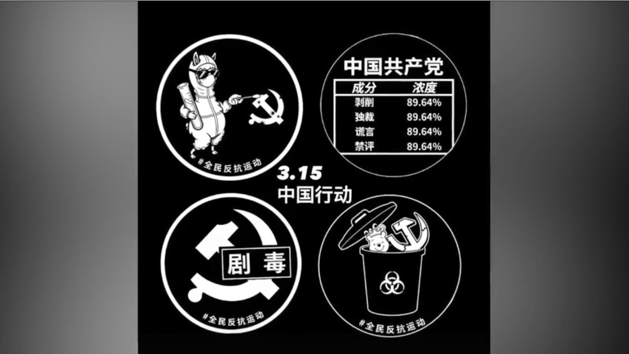 投影畫麵包括四組圖像。第一幅畫面顯示一隻身穿防護服的卡通羊駝形象手持試管,對帶有新冠病毒圖案的鐮刀錘子標誌進行「核酸檢測」。第二幅畫面模仿產品標籤,標示「中國共產黨」的四項「成分」為「剝削」「獨裁」「謊言」與「禁評」。第三幅畫面在鐮刀錘子圖案上疊加「劇毒」警示標誌。最後一幅畫面則將相關圖案投入標有生物危害標誌的垃圾桶。 蘇雨桐對記者說:「從謊言治國到言論審查,中共是中國社會系統性造假的根源。3.15這天,我們給出自己的檢測報告:劇毒,應予丟棄。」 系列投影行動持續擴大 這是「中國行動」針對中共海外使館的第四次投影活動。前兩次為2025年11月26日白紙運動三週年紀念日和2025年12月10日國際人權日在中共駐紐約總領事館,第三次是2026年1月1日在德國柏林中共大使館外的投影行動。 活動組織者表示,在此前幾次行動中,領館方面並未派人到現場阻擋投影,而此次則出現保安人員提前到場並遮擋光源的情況。 據瞭解,「中國行動」(China Action)是一個總部位於美國的非營利組織,主張以非暴力方式推動中國政治改革。該組織於2025年在多個城市發表《全民反抗運動宣言》,並在北美和歐洲多地發起投影行動。 △