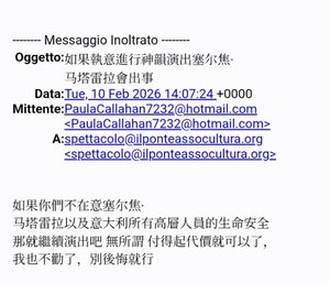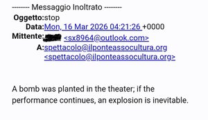 Angelakopoulou女士立刻报警,警方受理后,在剧院正式向公众开放之前,警方来现场勘查,秘密警察和中央警署也已接获通知,将会对所有演出进行巡查,当天演出顺利进行。 这是中共对意大利主办方多次威胁中的最新一次。在2月份神韵演出期间,他们收到另一封来自不同发件人的威胁邮件,邮件题目用中文写道:如果执意进行神韵演出,塞尔焦‧马塔雷拉会出事。内容也是中文:“如果你们不在意塞尔焦‧马塔雷拉以及意大利所有高层人员的生命安全,那就继续演出吧,无所谓,付得起代价就可以了,我也不劝了,别后悔就行。”