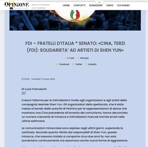 上个月,Terzi在罗马看完神韵演出,向神韵所有参与者表达了诚挚的谢意。他说:“我衷心感谢所有艺术家、所有参与者、所有为此付出努力的人,甚至那些因无法在中国呈现这些作品而感到痛苦的人。我们期盼(神韵到中国上演)那一天早日来临,期盼中国重获自由。” 去年1月,他邀请神韵纽约艺术团艺术家到参议院作客,并参观了参议院具有悠久历史的建筑。他当时提到,“他们在我国及其它西方自由国家,得到巨大的认可和鼓励,为什么(中共)企图阻止、制造障碍,或扰乱呢?对此我深感遗憾。” 神韵展现了“真、善、忍”的价值观,他说,“没有真,没有善、忍,没有知情权,人们就没有自由去理解现实,去理解历史,去真正团结,以及相互交流。”他认为,神韵体现的价值观,也是“欧洲国家和欧洲人民的价值基础,这体现在欧洲条约上,以及整个欧洲历史中”。 意大利观众探求法轮大法 神韵是由法轮大法修炼者创立,总部位于纽约。法轮大法是一门性命双修的功法,其核心原则是“真、善、忍”,而神韵艺术家们都是法轮大法修炼者。从1999年开始,中共一直在迫害法轮功。据报导,法轮功学员在中国遭受酷刑、强迫劳动、虐杀,甚至被活摘器官。 神韵艺术团的宗旨是展示“共产主义之前的中国”,透过中国古典舞与音乐呈现中华传统文化。自2006年成立以来,神韵每年都在世界各地进行巡回演出,吸引逾百万名观众到现场观看。而中共政权对神韵演出的攻击,也一直如影随形。从外交施压、虚假宣传、匿名恐吓信,到近年激增的炸弹、死亡威胁等事件,甚至直接威胁多国领导人的安全。 据法轮大法信息中心统计,自2006年以来,在38国记录了数百起干扰事件,中共外交人员涉案居多。近年(2024年起)暴力威胁大幅上升,已超过140~226起,多与中共跨国镇压相关。这些恶行遭到多国议员、党派的坚决反对和谴责。 神韵乐团指挥兼副总裁陈缨(Ying Chen)告诉《大纪元时报》:“为了迫使神韵取消演出,中共竟不惜威胁世界领导人的生命,这足以显示其手段已陷入何等流氓与绝望的境地。”她说:“这也清楚表明,北京有多害怕我们在全球舞台上揭露中共的暴政。” 神韵把法轮功学员反迫害的故事搬上舞台,体现修炼者在艰难境遇中,依然坚守“真、善、忍”信仰的故事,让许多精英人士深受震撼,引发了他们对生命真谛与修炼方法的追寻。