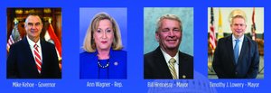 美國密蘇里州州長Mike Kehoe、國會眾議員Ann Wagner、弗洛里森特市長Timothy J. Lowery,以及奧法倫市長Bill Hennessy向神韻藝術團頒發褒獎與賀信。(大紀元合成圖)