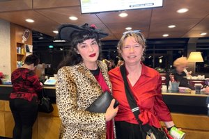 2026年3月25日晚,非營利組織總裁、認證總裁教練Rydé Harding(左)與同為總裁教練的友人Catherine Fox觀看了神韻國際藝術團在加拿大基奇納中央廣場劇院(Centre In The Square)的第二場演出。(滕冬育/大紀元)