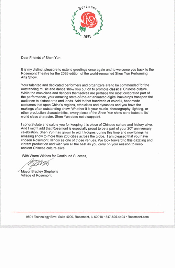 自2016年神韵首次在罗斯蒙特剧院(Rosemont Theatre)演出以来,罗斯蒙特市长Bradley Stephens年年发出官方贺信。今年是他第十年欢迎神韵艺术团。他在贺信中表示:“我对你们(神韵)致力于传承这份中国文化与历史的努力表示祝贺与致敬。我要补充的是,罗斯蒙特为能参与神韵20周年庆祝感到格外自豪 。”