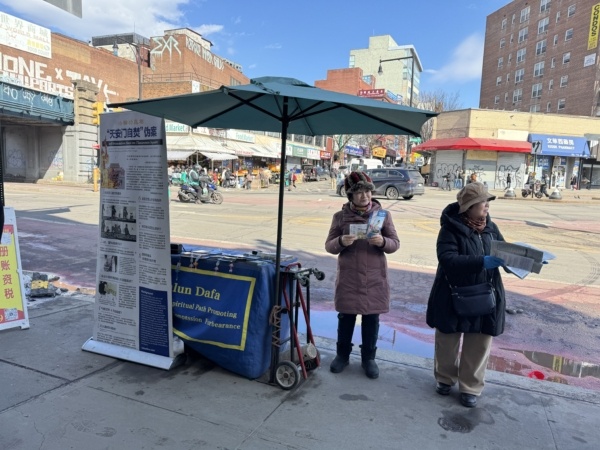 位于纽约华人社区法拉盛缅街(Main St.)的法轮功宣传点和“三退”服务点。(林丹/大纪元)