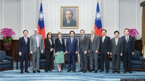 台湾总统赖清德会见美国参议院外交委员会民主党首席成员沙欣(Jeanne Shaheen)和共和党参议员匡希恒(John Curtis)所率跨党派代表团。(2026年3月30日)