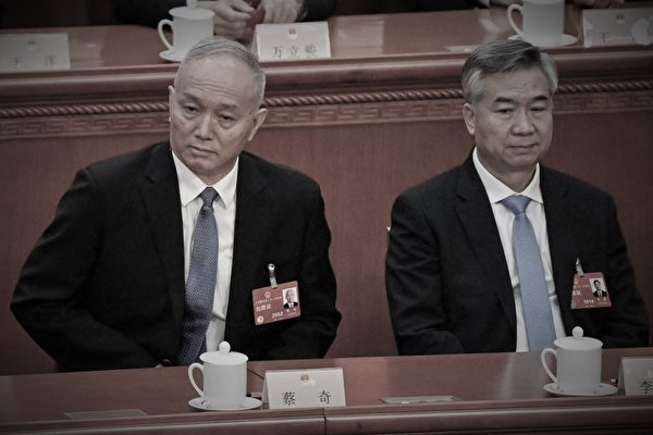 图为2023年3月12日,中共政治局常委蔡奇(左)和李希(右)出席中共人大会议。(Noel Celis/AFP)