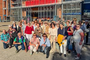 2026年4月7日下午,全国退休人员和老年人联盟UNRPA的主席Pierree Chantal Daniere(前排左三)率团观看神韵世界艺术团本年度在里昂国际城圆形剧场(L’Amphithéâtre 3000)的第二场演出。图为他们在剧院前合影。(甄秀欣/大纪元)